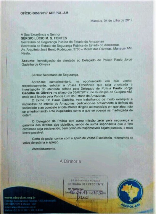 Na última quinta-feira, (06) a Associação de Delegados de Polícia do Estado do Amazonas –ADEPOL-AM, entrou com pedido na Secretaria de Segurança Pública e Delegacia Geral para que seja priorizada a investigação do atentado sofrido pelo Delegado de Polícia e associado da Adepol-AM, Paulo Jorge Gadelha, no último dia 03/07, no município de Guajará- AM, onde está lotado pela Policia Civil do Estado do Amazonas e como resposta ao pedido, nesta sexta feira dia (07), investigadores e policiais civis conseguiram prender os autores do crime.