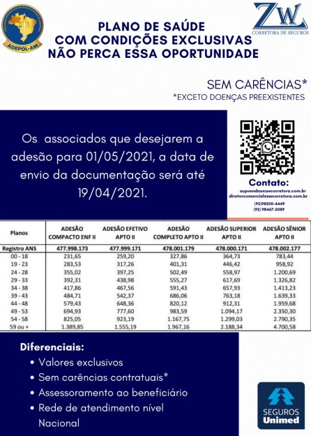 O aniversário do plano da Adepol AM e Seguros Unimed está chegando (01/05/2021)! Com isso, há a possibilidade de troca de plano e inclusão sem carêncas (exceto doenças preexistentes).